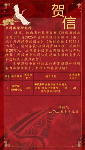 近日,国家自然科学基金委员会正式公布2025年度项目评审结果,西安医学院全科医学研究所冯巩副教授牵头申报的青年科学基金项目(C 类)——《基于多中心队列 Fibrotic MASH 无创评估模型开发及其多组学特征解析》成功立项,获批经费30万元。